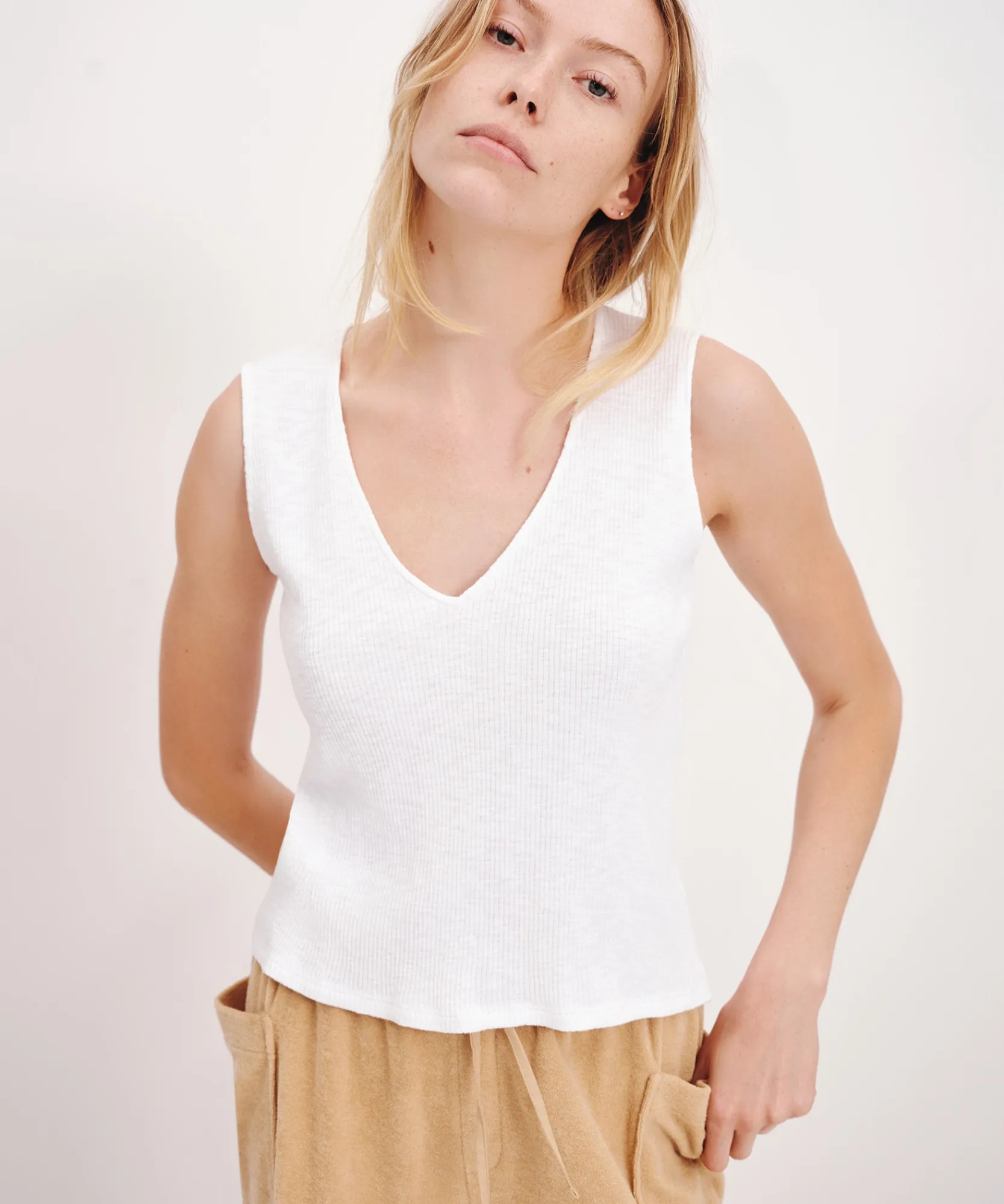 The 4X2Rib Muscle Tee is an ultra soft and relaxed staple newly fabricated with slub yarns. It features a ribbed body and a deep v-neckline.