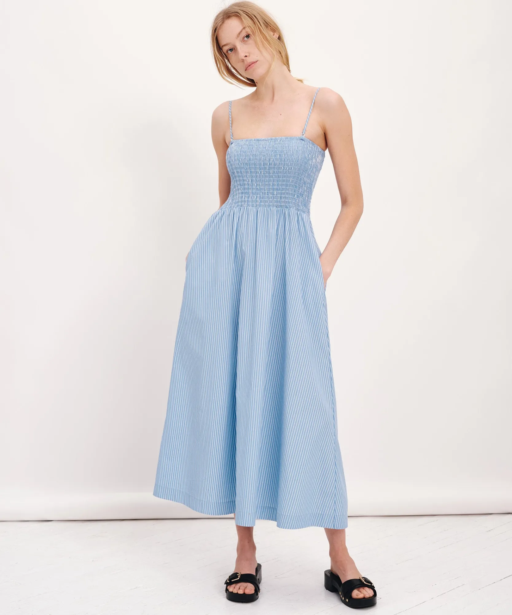 The Superfine Twill Stripe Smocked Dress is a soft and flowy wardrobe staple. It features removable grosgrain straps and side seam pockets.