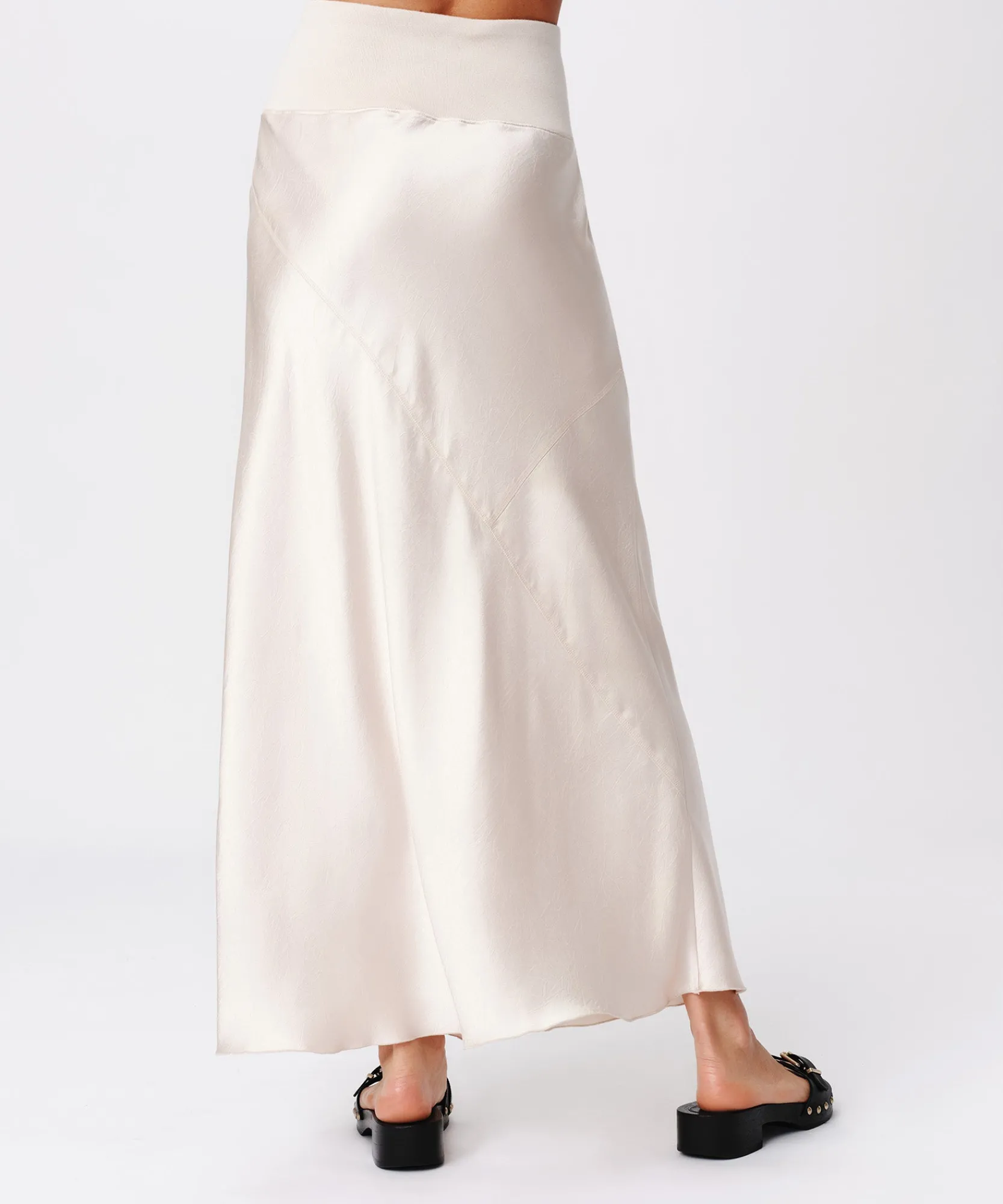 The Cracked Satin Bias Maxi Skirt is an airy, supersoft style crafted with a ribbed waistband and coverstitch details on the front and back. Part of set with matching shirt.
