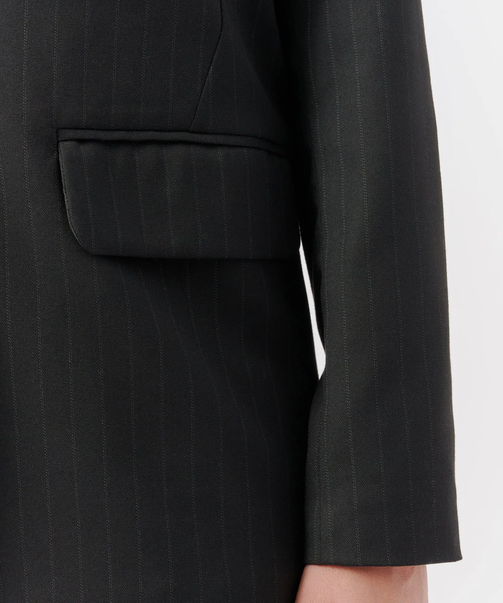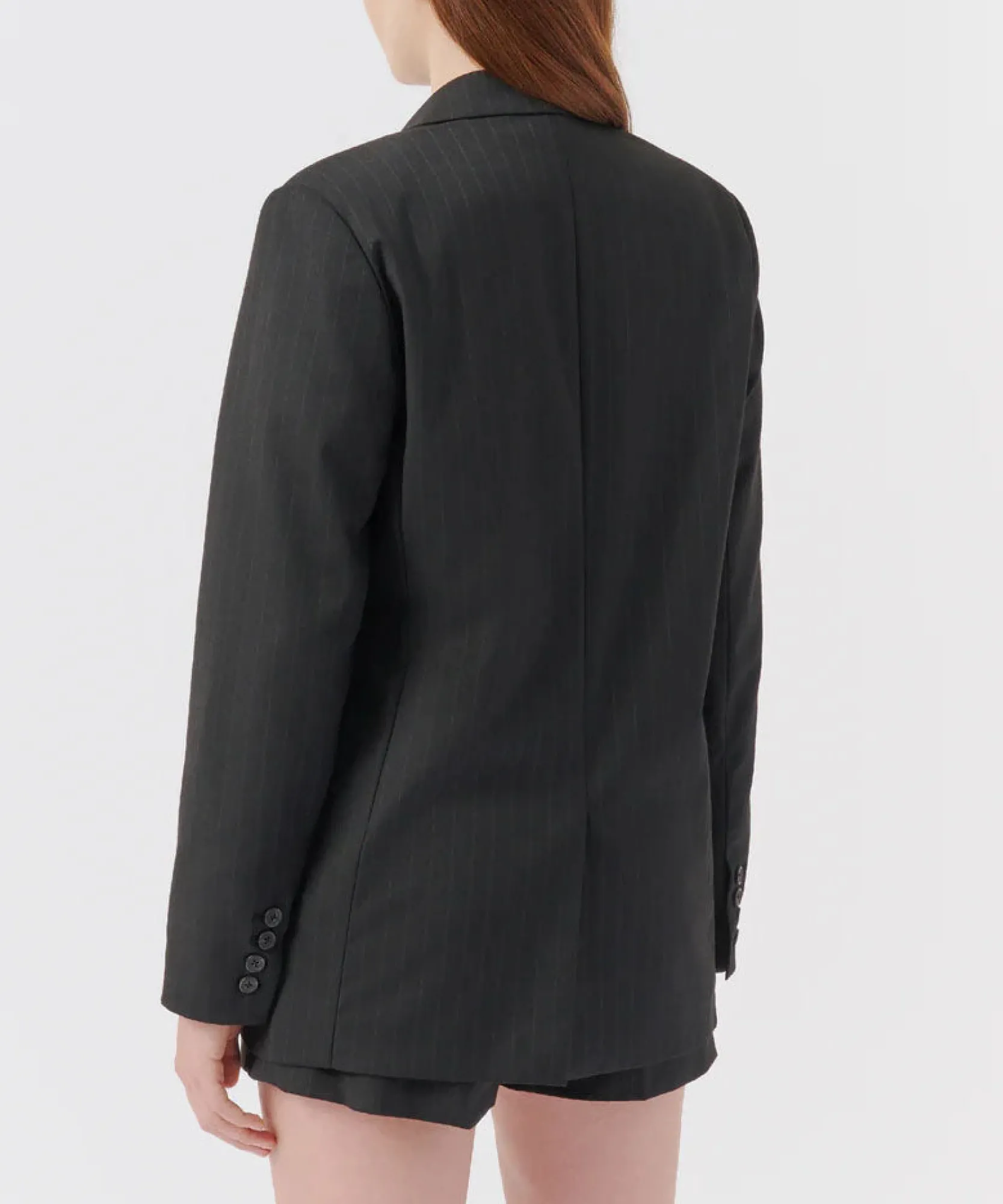 The Pinstripe Twill Boyfriend Blazer combines the appeal of an oversized men’s jacket with the flattering fit of a women’s silhouette. The drop shoulders and oversized arms give the tailored piece a more relaxed look. Part of a set with matching shorts.