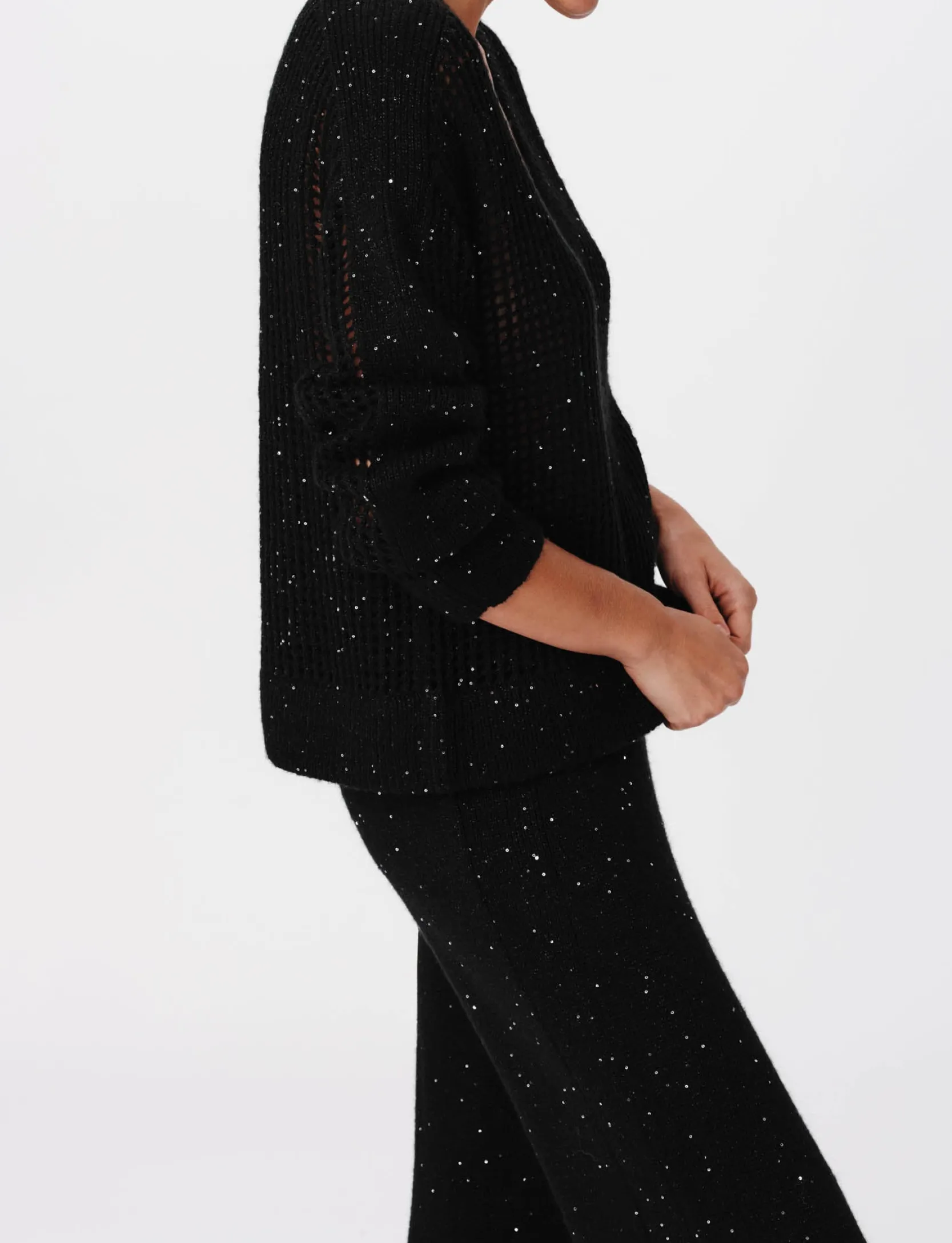 The Sequin Wool Blend Net Stitch Sweater is an ultra relaxed V-neck style with a loosely draped silhouette. It features wool and mesh blended stitching with sequins. Part of set with matching pants.