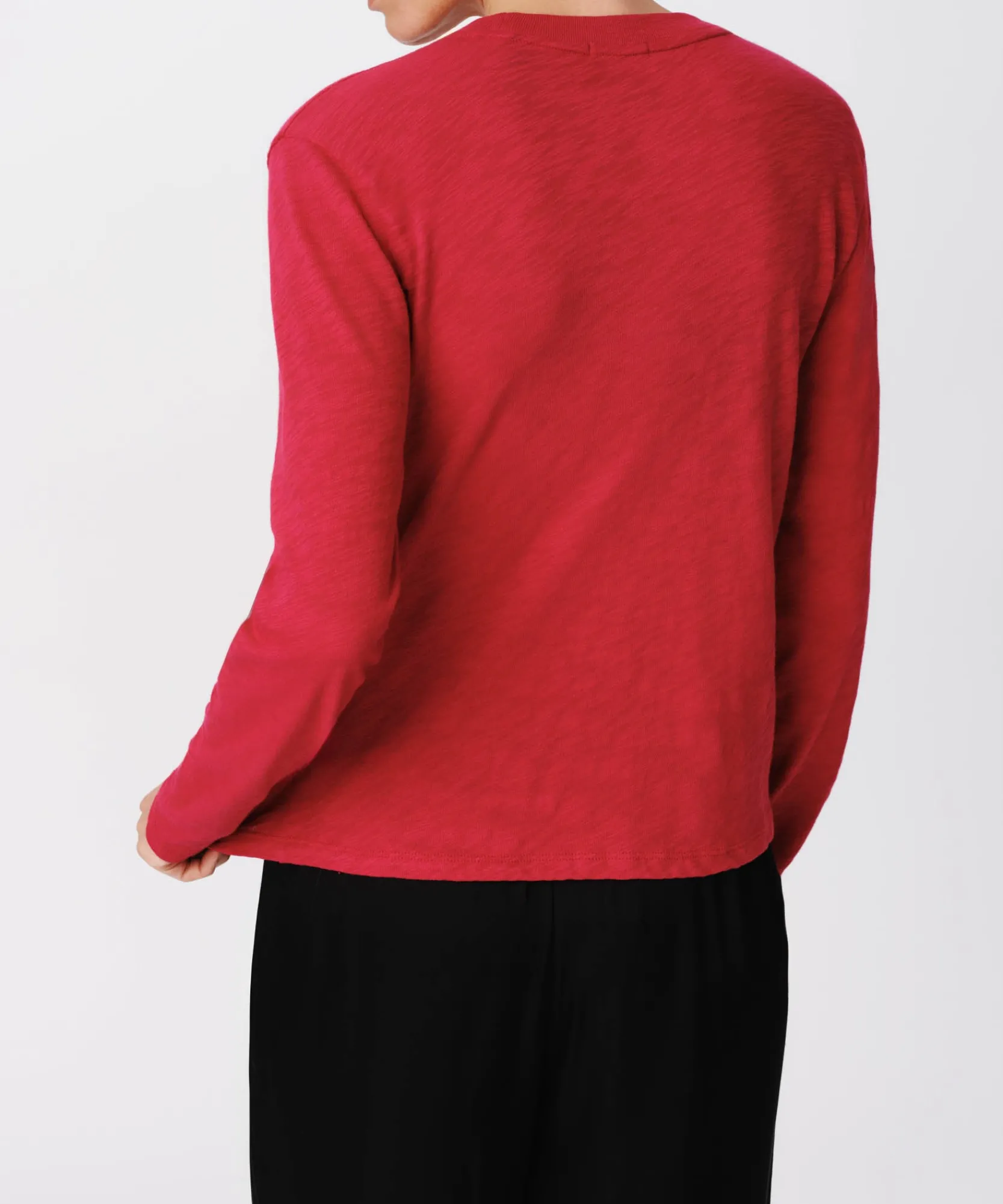 The Slub JerseyLong Sleeve Crop Tee gets its texture from the uneven yarns of our unique Peruvian Cotton. It features a relaxed crew neck silhouette and metallic foil treatment. The loose weave of this heavier Cotton meets the slightly shrunken cut of the hem.