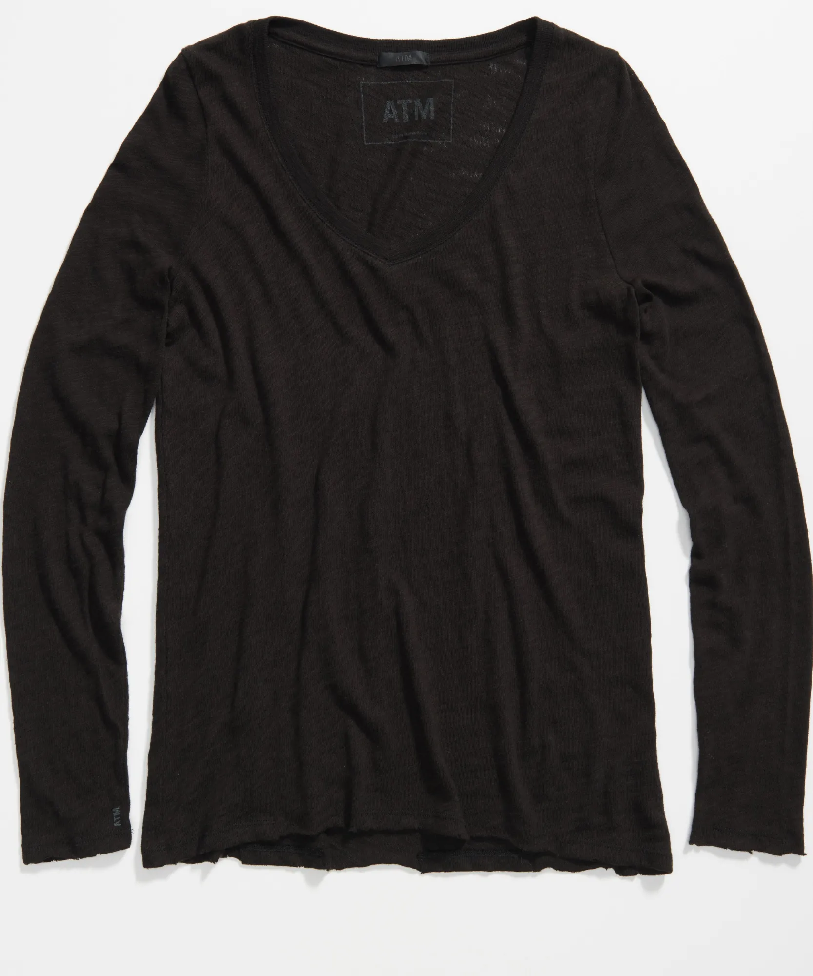 The slub jersey long sleeve v-neck tee gets its texture from the uneven yarns of ATM’s unique Peruvian cotton. It features a relaxed v-neck silhouette, matte finish, raw hem and sleeve cuffs, and just the right amount of sheer.