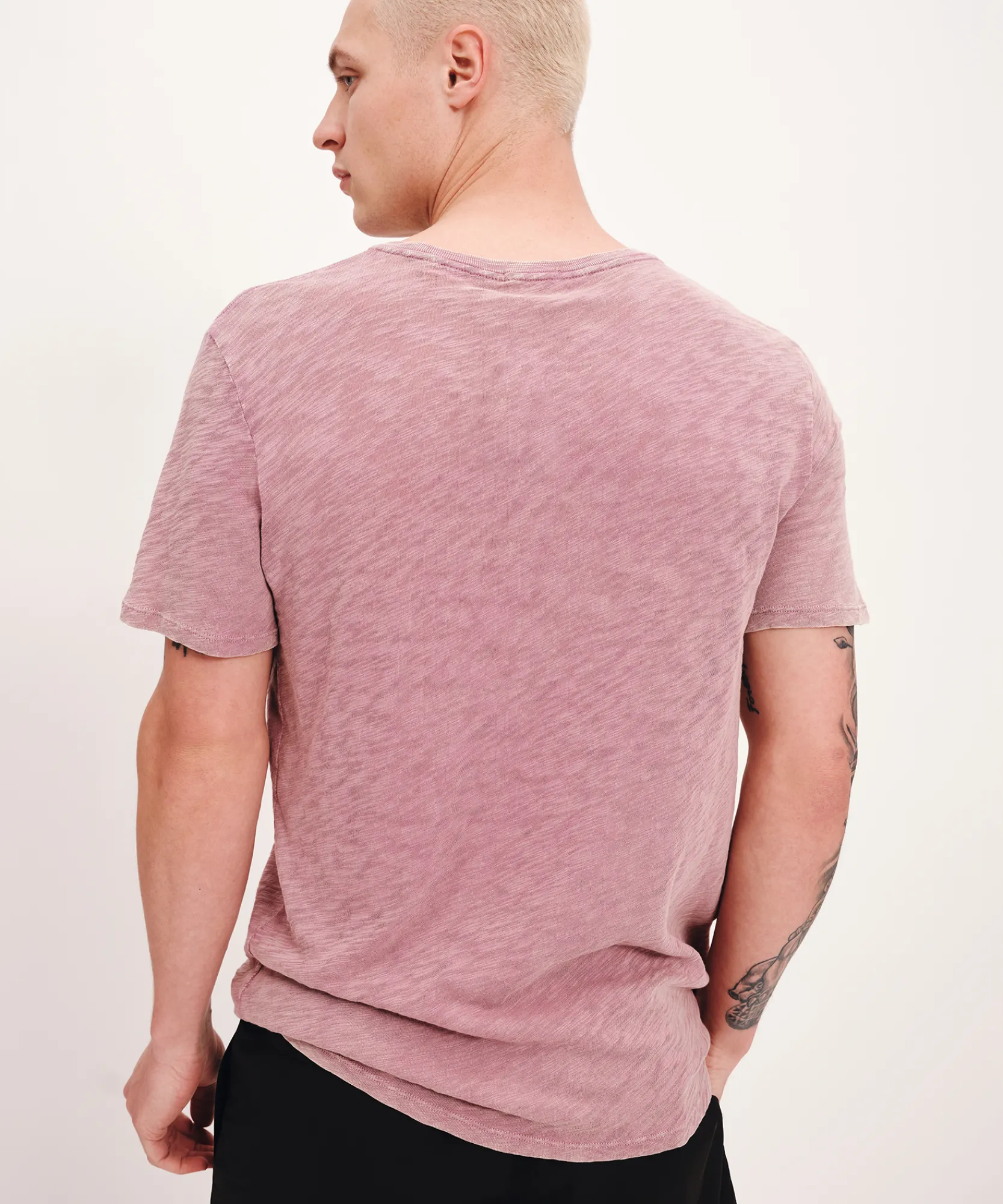 The Slub Jersey With Chroma Wash Short Sleeve Crew Neck Tee gets its texture from the uneven yarns of our unique Peruvian cotton. It features a relaxed crew neck silhouette, short sleeves and has a subtly sheer look. The loose weave of this heavier cotton molds modestly to the body offering the perfect drape. Updated this season with a unique wash treatment applied to give each tee its unique look.
