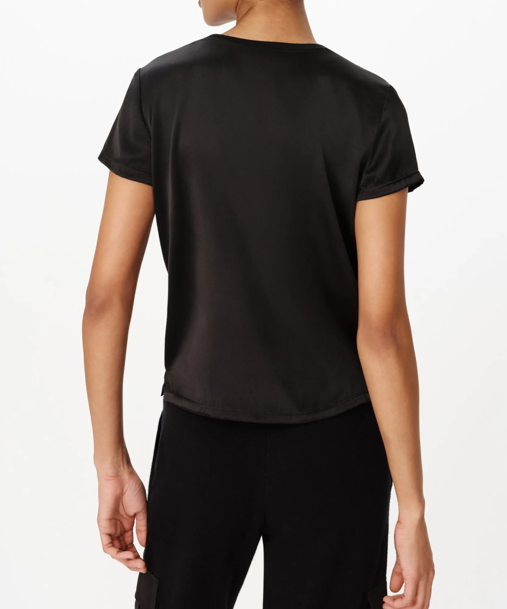 The Stretch Charmeuse V-Neck Tee is a fitted and fluid silhouette constructed with slight stretch for extra comfort. It is finished with a silky sheen, flat neckband, sleeves and, hem with short side slits.