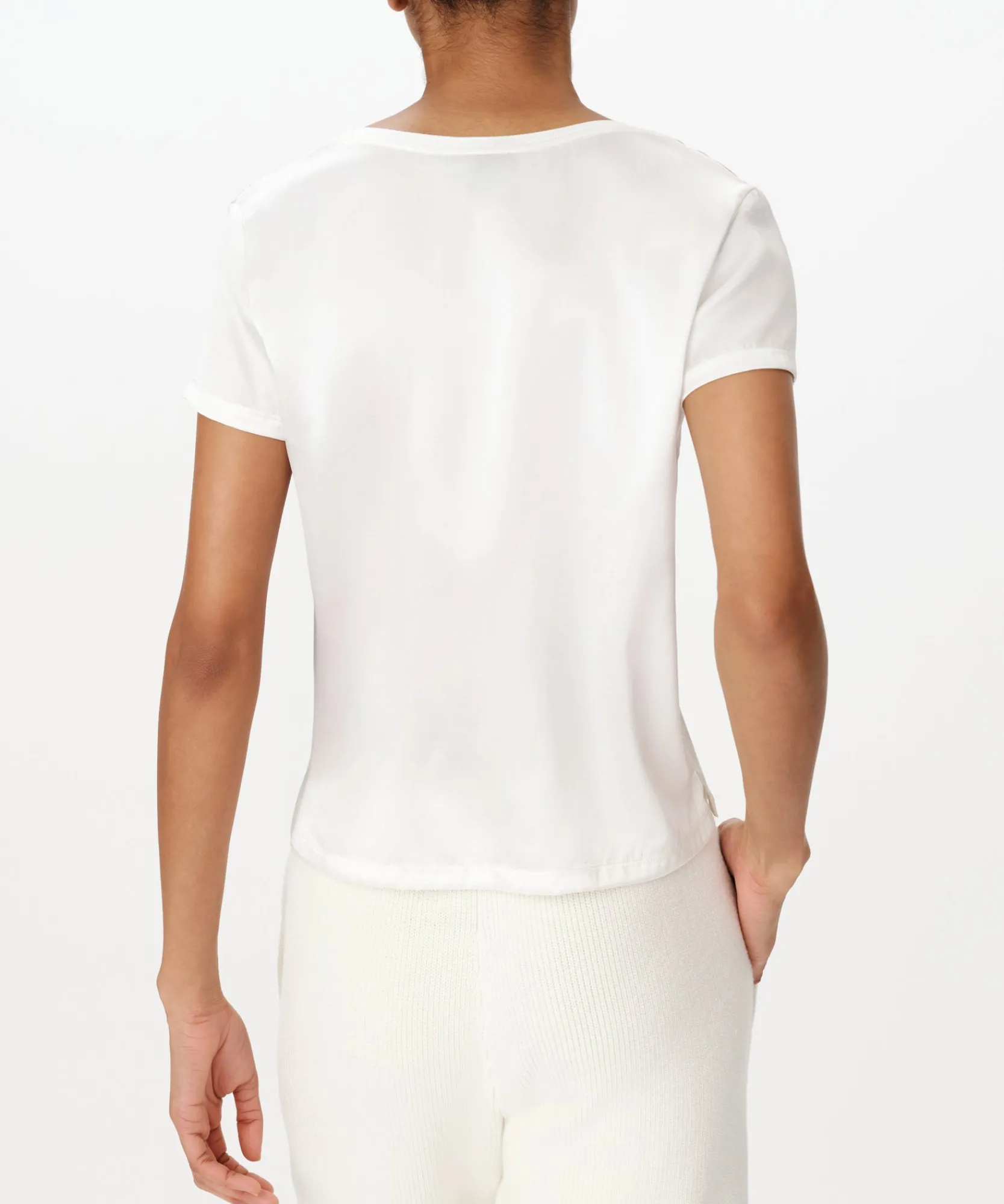 The Stretch Charmeuse V-Neck Tee is a fitted and fluid silhouette constructed with slight stretch for extra comfort. It is finished with a silky sheen, flat neckband, sleeves and, hem with short side slits.